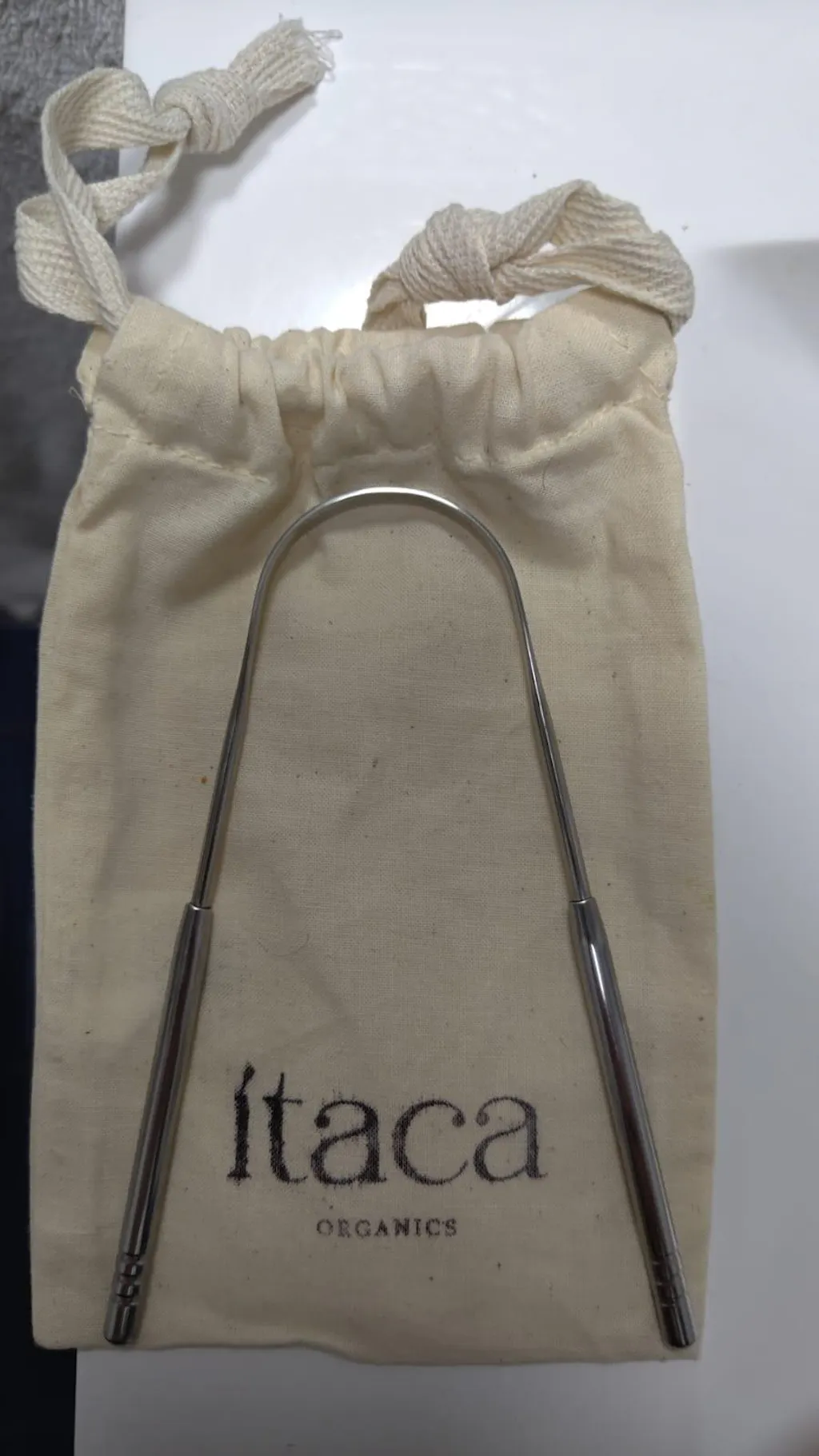 El raspador lingual de Ítaca Organics está fabricado con acero inoxidable, lo que lo hace resistente, seguro y fácil de limpiar.